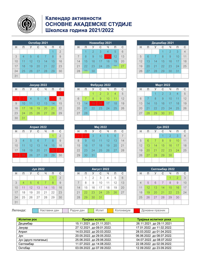 Календар активности у школској 2021/2022. години на Основним академским студијама.