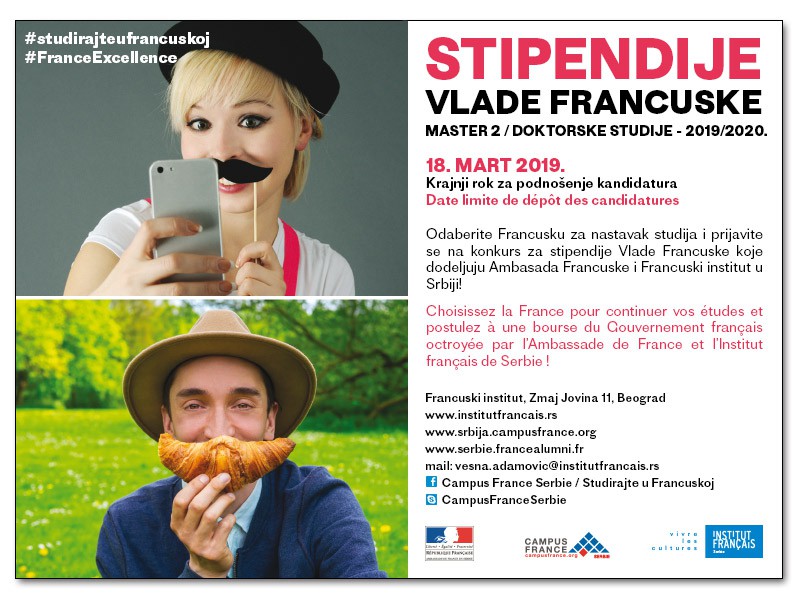 Као и сваке године, Амбасада Француске и Француски институт расписали су конкурс за стипендије Владе Француске за мастер 2 ниво и докторате у коменторству за студије на француском или енглеском језику.