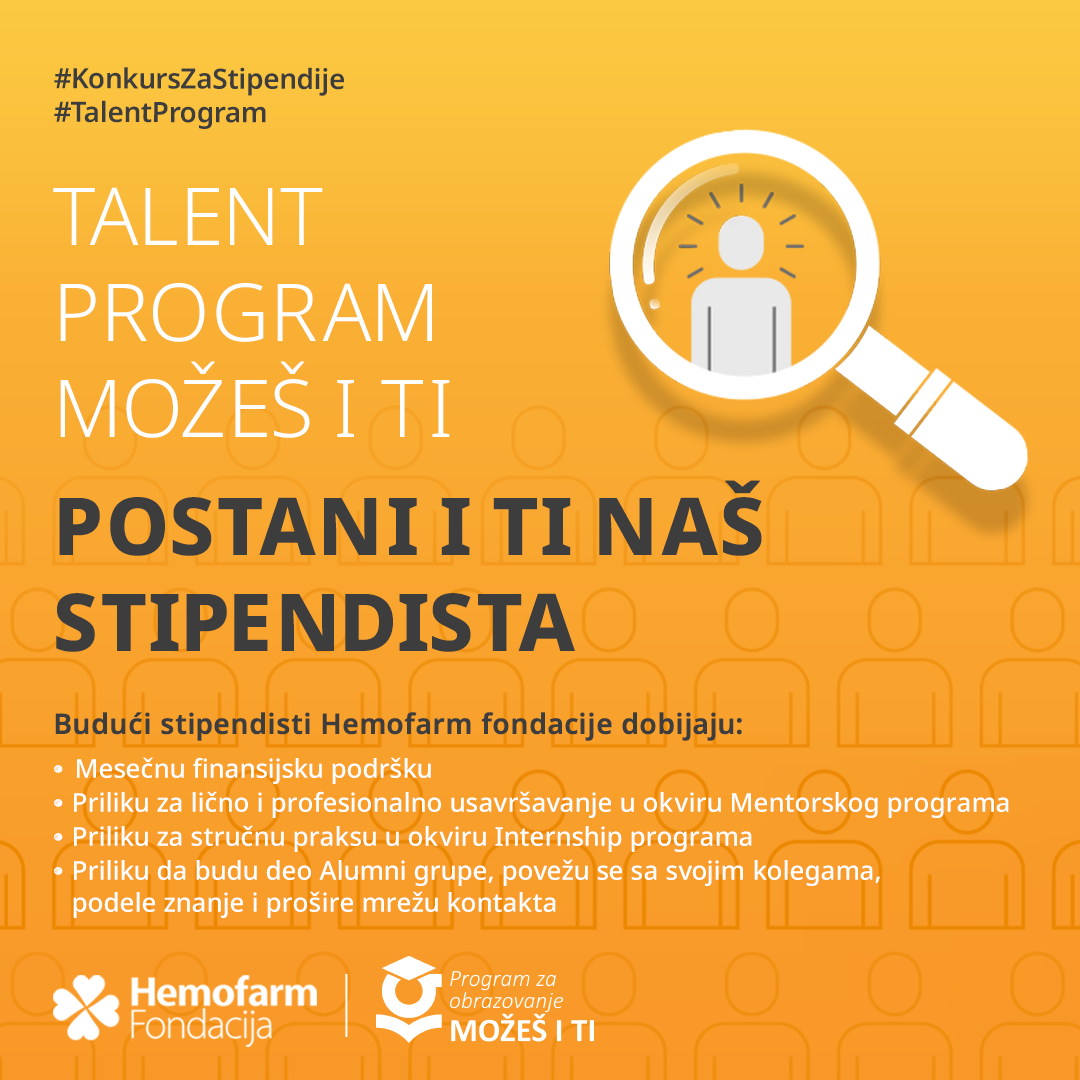 Конкурс је отворен до 4. новембра за студенте државних универзитета у Србији, који су у досадашњем студирању остварили просек оцена најмање 8,50. Сви они имају прилику да се пријаве за учешће у једногодишњем Програму за образовање „Можеш и ти“ Хемофарм фондације, који обухвата месечну стипендију, менторску подршку и стручну праксу у Србији и Немачкој. Такође, уз подршку експерата Хемофарма и Штаде, стипендисти имају шансу да унапреде своја знања и вештине, формалне и неформалне, које су неопходни за даљи лични и професионални развој. Током ових годину дана, полазници програма стичу и радно искуство у различитим секторима и додатни мотив да стечено знање примењују у Србији.