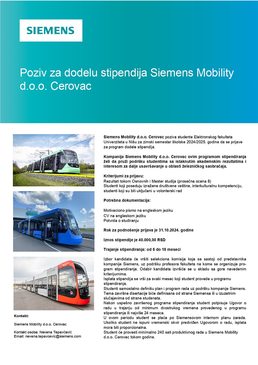 Компанија Siemens Mobility Србија позива студенте Електронског факултета Универзитета у Нишу да се пријаве на конкурс за доделу стипендија за школску 2024/25 годину.