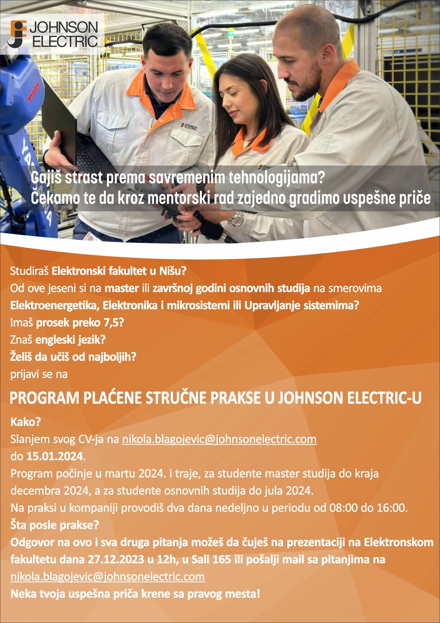Пријаве слати до 15. јанауара 2024. године слањем свог CV-ја на мејл nikola.blagojevic@johnsonelectric.com.