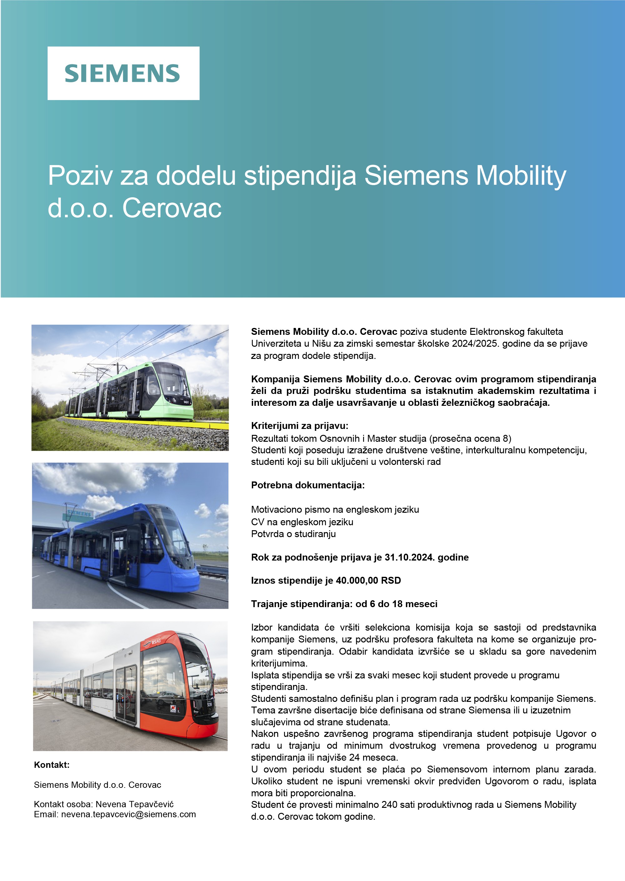 Компанија Siemens Mobility d.o.o. Церовац овим програмом стипендирања жели да пружи подршку студентима са истакнутим академским резултатима и интересом за даље усавршавање у области железничког саобраћаја.