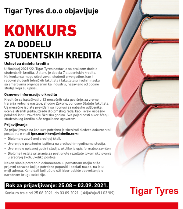 Компанија Tigar Tyres doo расписује конкурс за доделу студентских стипендија.