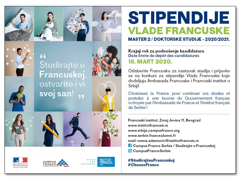 Као и сваке године, Амбасада Француске и Француски институт расписали су конкурс за стипендије Владе Француске за мастер 2 ниво и докторате у коменторству, за студије на француском или енглеском језику. Све области су заступљене. Студенти сами одлучују о избору студијског програма.