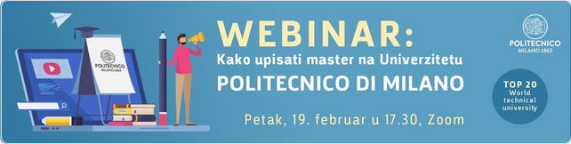 WEBINAR – "Kako upisati master na Univerzitetu Politecnico di Milano" održaće se u petak 19. februara s početkom u 17.30 a namenjen je studentima iz Srbije, Crne Gore i BiH. Održava se na Zoom platformi, učešće je besplatno.