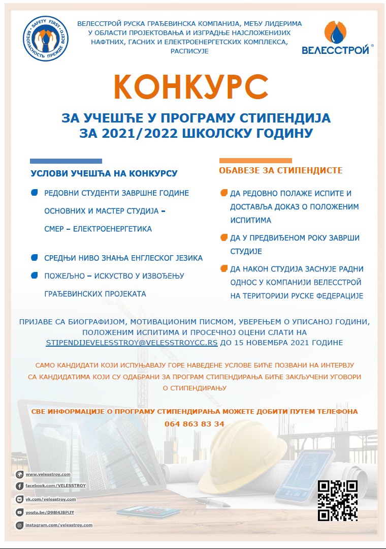 Руска компанија Велестрој расписује конкурс за доделу студентских стипендија.