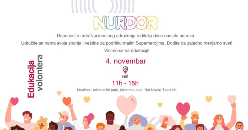 НУРДОР и ове године, у суботу 4. 11. 2023. године у периоду од 11 до 14 часова организује едукацију волонера у Нишу у Научно-технолошком парку, која је намењена свим заинтересованима који желе да постану део НУРДОР-овог тима.