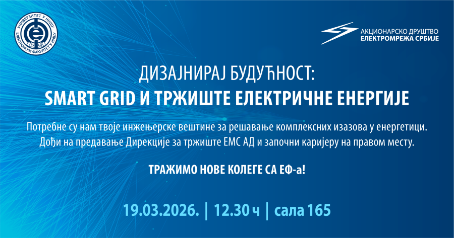 Предавање на тему "Дизајнирај будућност: Smart grid и тржиште електричне енергије" комапније Електромрежа Србије одржаће се на Електронском факултету 19. марта од 12.30 сати у сали 165.