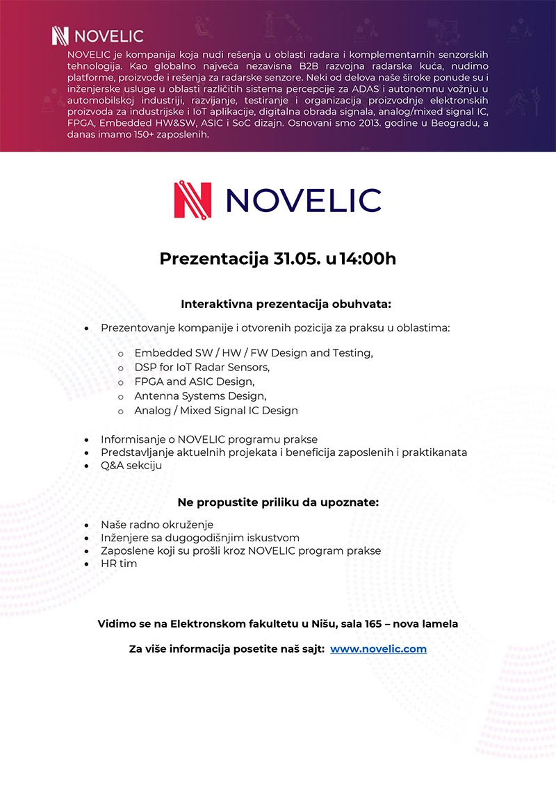 Презентација компаније "Novelic", која нуди решења у области радара и комплементарних сензорских технологија, одржаће се 31. маја 2022. године у 14 ч у сали 165 у оквиру нове ламеле Електронског факултета.