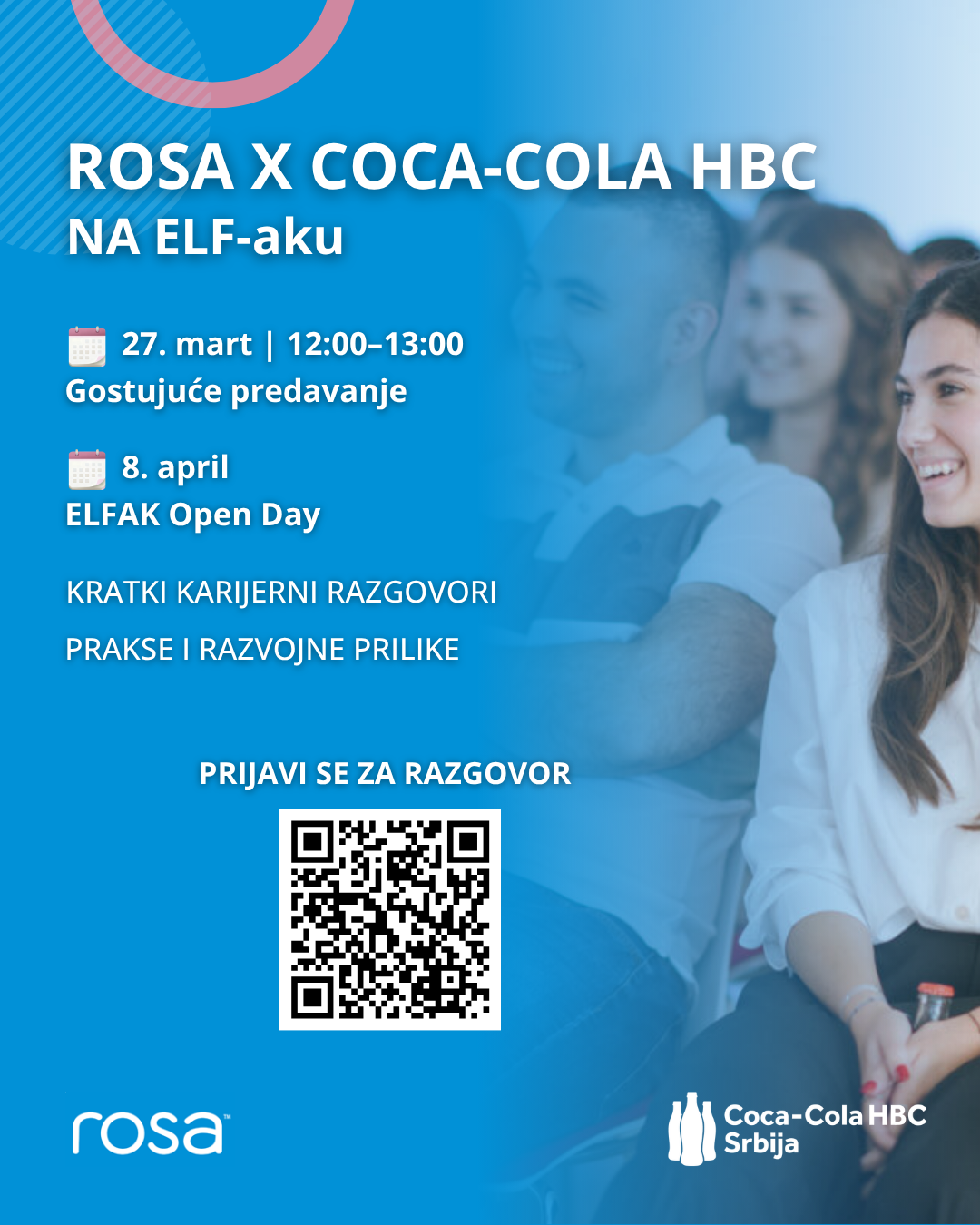Електронски факултет Универзитета у Нишу угостиће представнике Фабрике воде Роса, која послује у оквиру компаније Coca-Cola HBC Srbija, на гостујућем предавању које ће бити одржано 27. марта 2026. године, у термину од 12.00 до 13.00 часова у Сали 165.
